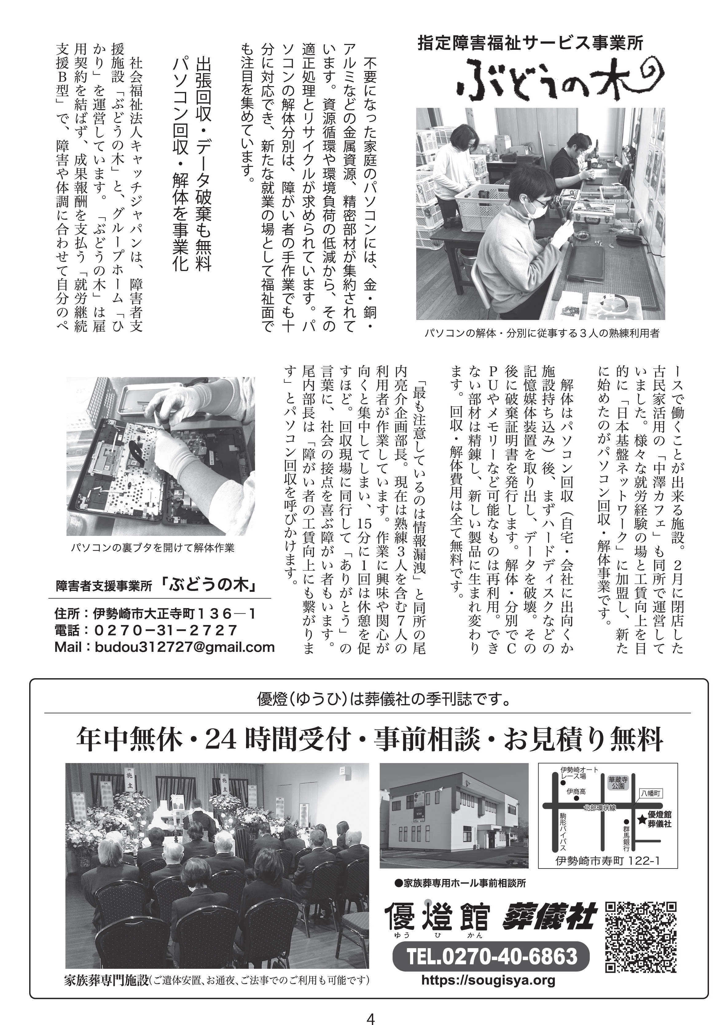 障害者支援施設「ぶどうの木」パソコン回収・解体を事業化(4面)