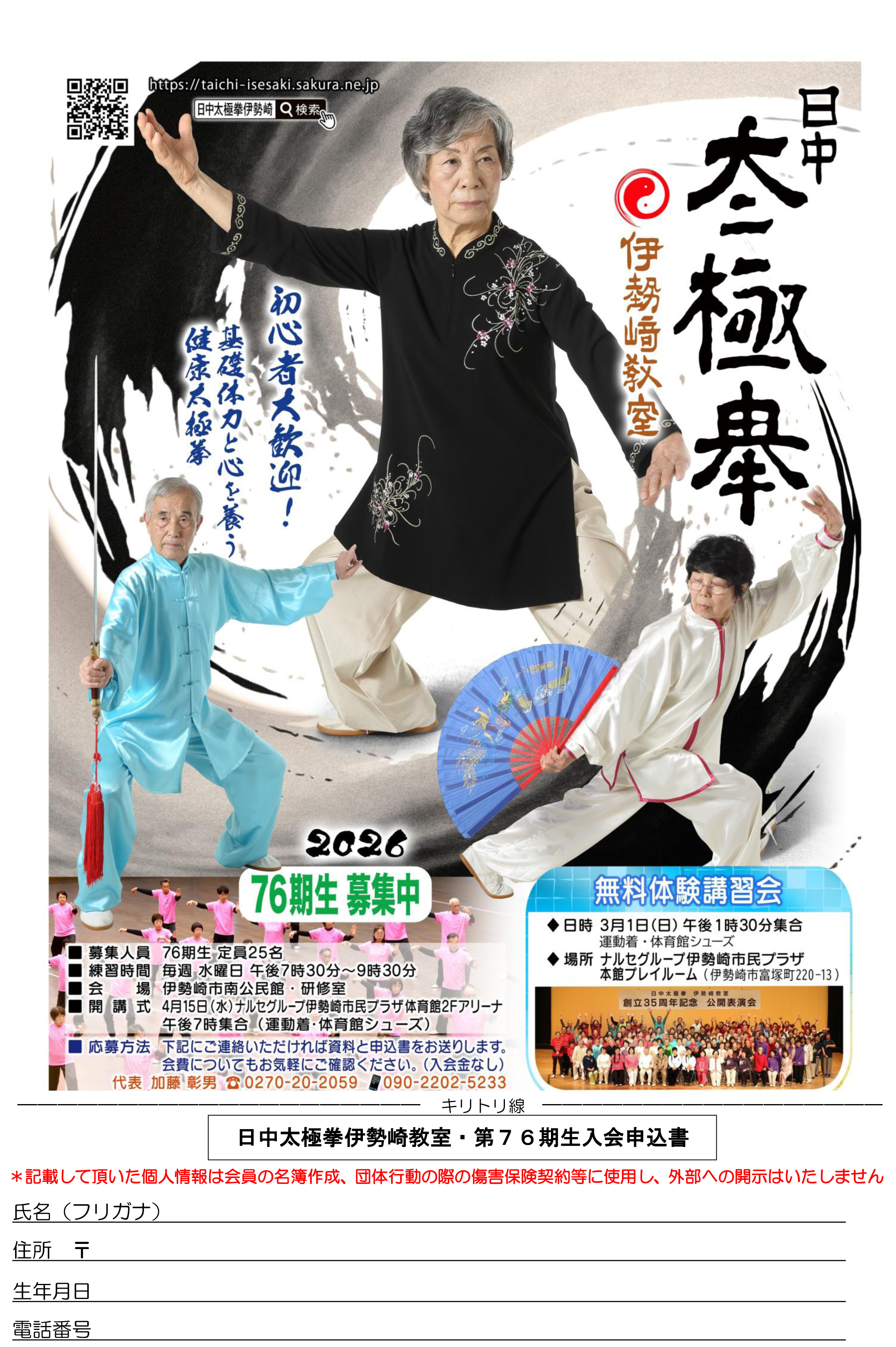 日中太極拳伊勢崎教室7無料体験講習会(76期生も募集中)
