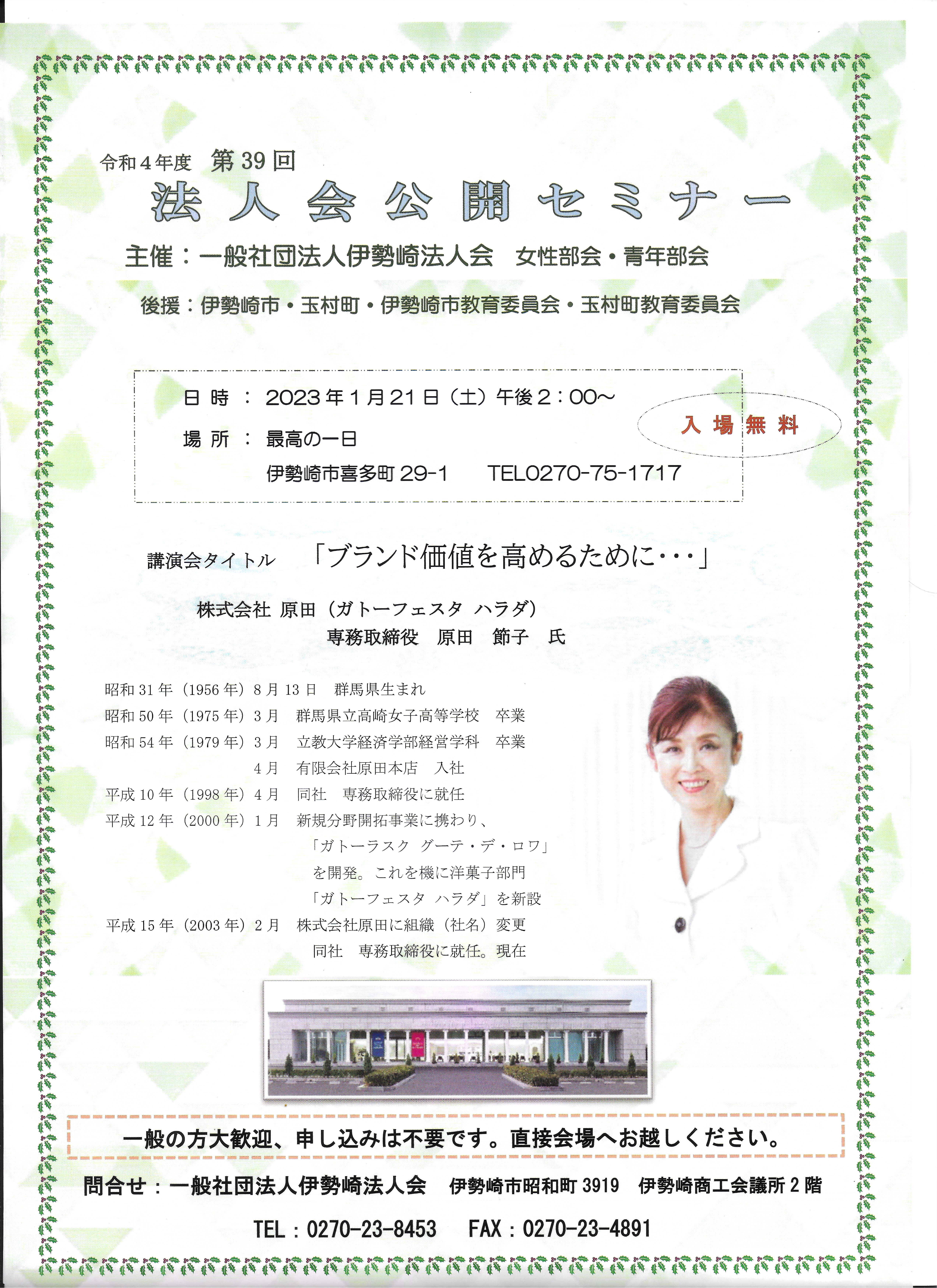 事前申し込み不要/問い合わせは一般社団法人伊勢崎法人会へ