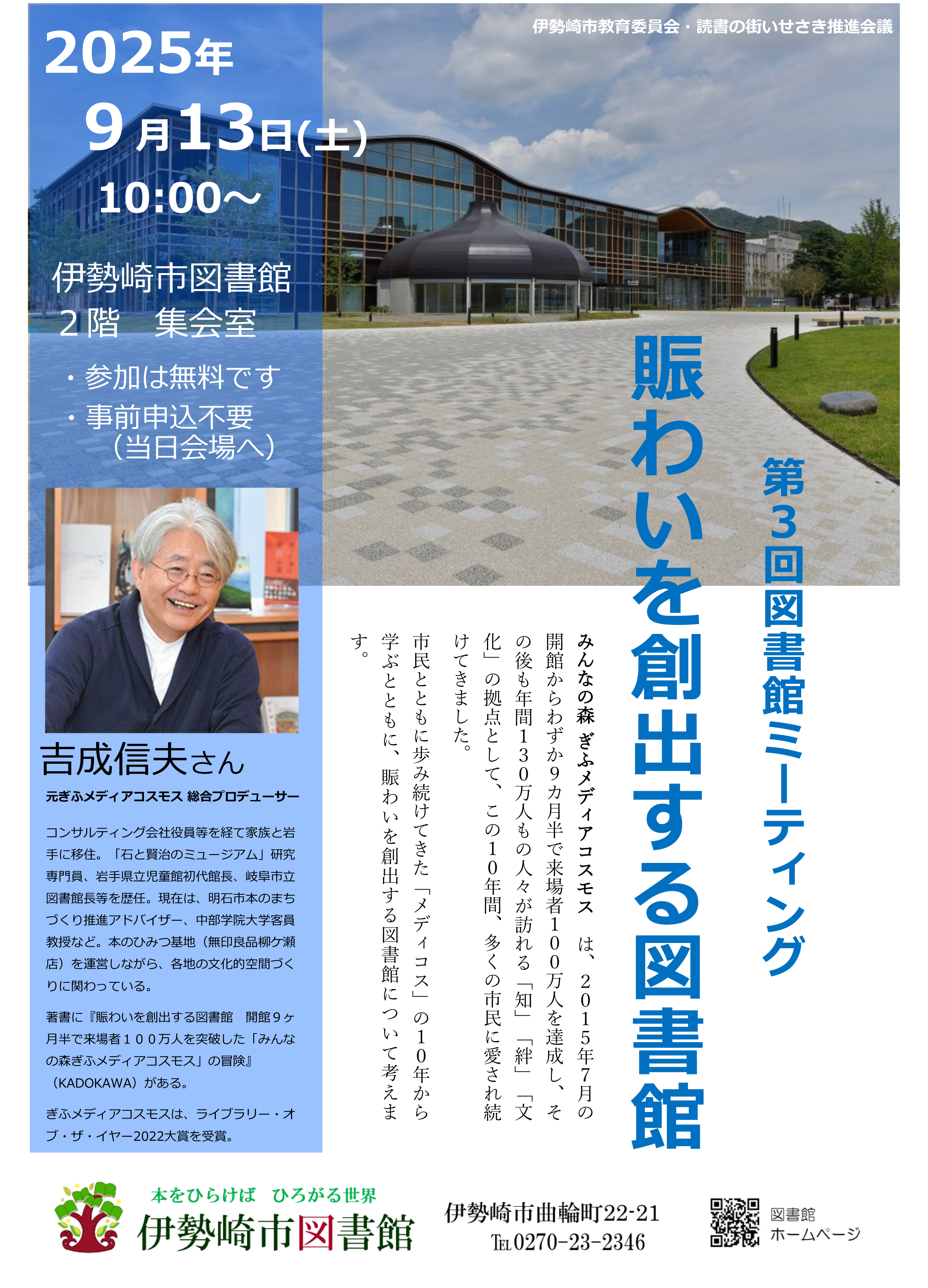 開催日時:9月13日(土)午前10時から伊勢崎図書館2階集会室